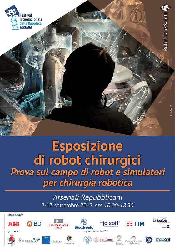 Per tutta la durata del Festival Internazionale della Robotica sono stati a disposizione per una prova pratica i più utilizzati sistemi di chirurgia robotica ad uso clinico ed i rispettivi simulatori. Dal robot da Vinci di Intuitive Surgical, impiegato in chirurgia generale e dei trapianti, urologia, ginecologia, chirurgia toracica, e otorinolaringoiatria, ai sistemi Mako (Stryker) per chirurgia del ginocchio e dell’anca, al Renaissance di Mazor per la chirurgia spinale, ai sistemi di navigazione per chirurgia di Masmec ed al sistema per microchirurgia di MMI. Per i simulatori chirurgici sono stati esposti i più avanzati simulatori per chirurgia robotica (dV-Trainer di Mimic a da Vinci Skills Simulator di Intuitive Surgical), chirurgia laparoscopica (LapSim di Surgical Science) e chirurgia endovascolare (Angio Mentor di Simbionix).