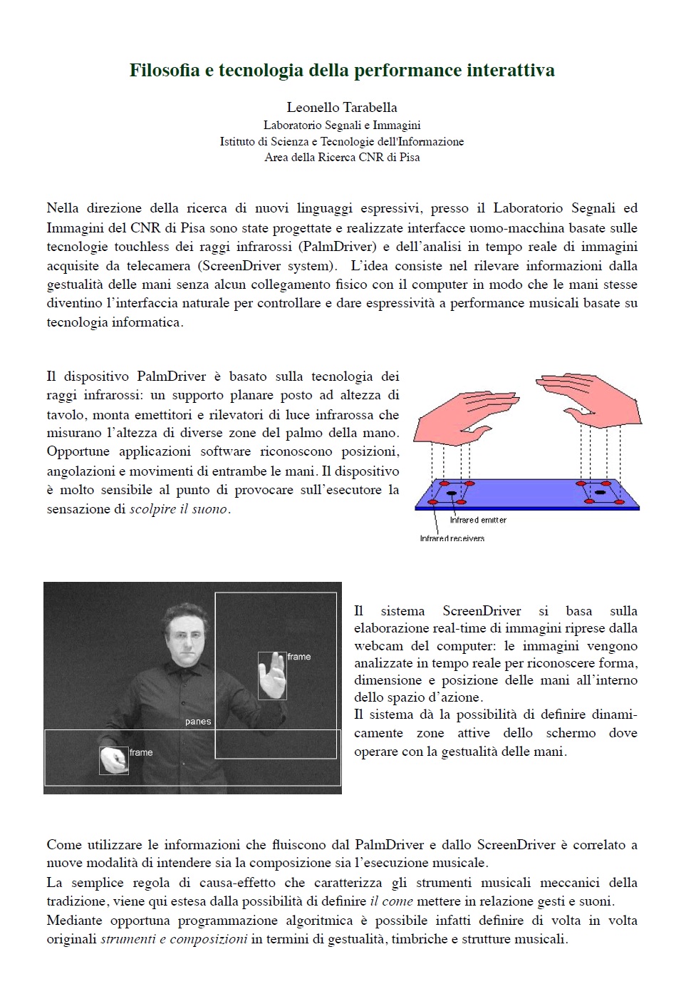 Negli anni ’90, a seguito del Workshop Man-Man Machine interaction in Live Performance organizzata dal CNUCE e insieme alla Scuola Sant’Anna, ad opera di Leonello Tarabella e Graziano Bertini furono avviate ricerche che portarono alla realizzazione di sistemi e dispositivi di rilevamento gestuale “touchless” per il controllo real-time di performance multimediali basate su tecnologia digitale.